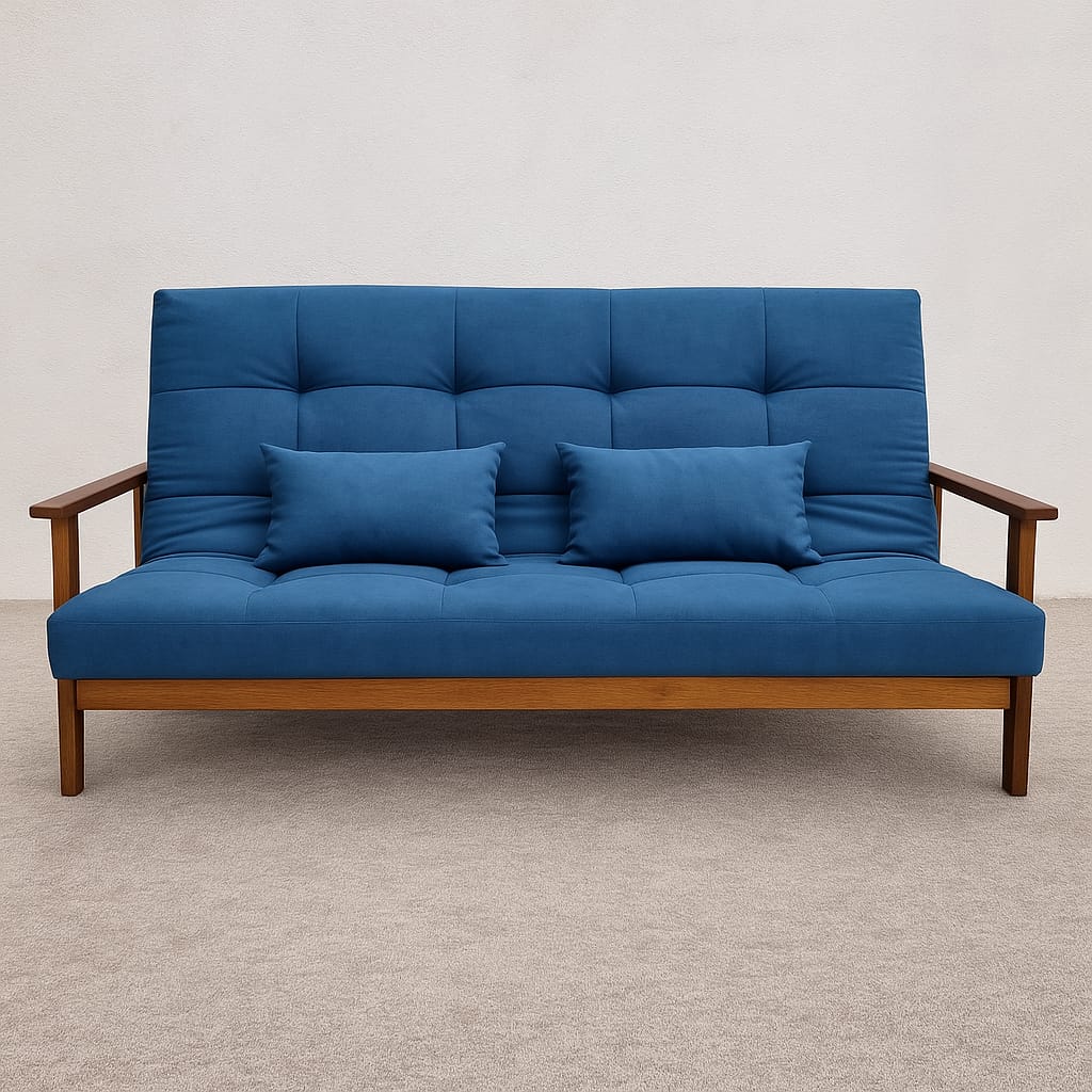 Base madera de pino, colchoneta relleno de poliuretano y delcron laminado. Tela 100% algodón.